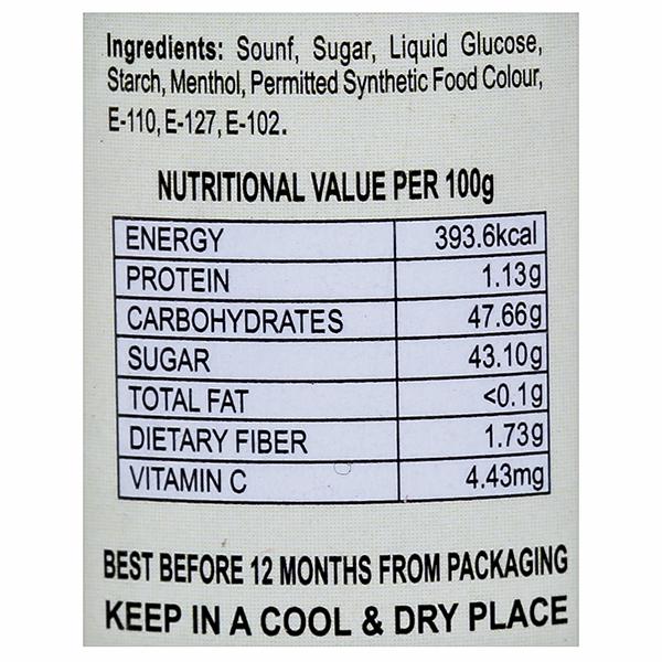 Ingredients- Saunf, sugar, liquid glucose, starch, menthol, permitted synthetic food color, E-110, E- 127, E-102