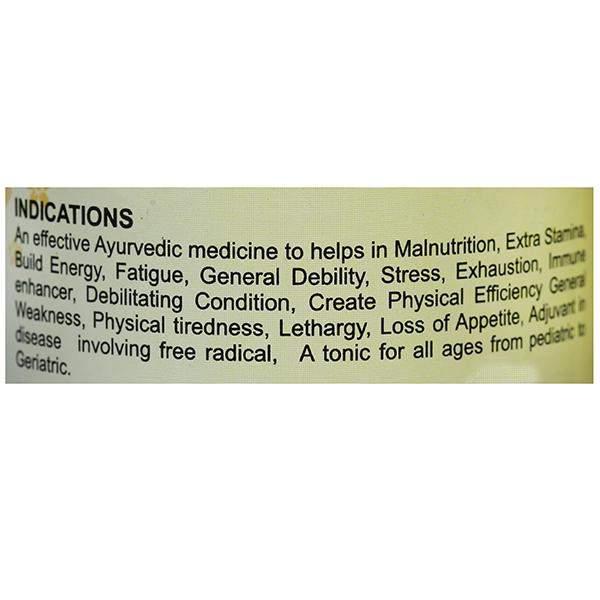 Product Information - An effective Ayurvedic medicine to helps in Mal nutrition, Extra Stamina, Build Energy, Fatigue, General Debility, Stress, Exhaustion, , Immune enhancer, Debilitating Condition, Create Physical Efficiency Helps in premature aging General Weakness Physical tiredness , Lethargy, Loss of Appetite , Adjuvant in disease involving free radical, A tonic for all ages from pediatric to Geriatric