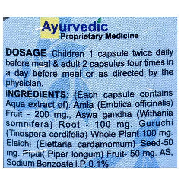 Amla (Emblica Officinalis) Fruit - 200 mg, Aswagandha (Withania Somnifera) Root - 100 mg, Guruchi (Tinospora Cordifolia) whole plant 100 mg, Elaichi (Elettaria cardamomum) Seed- 50 mg, Pipul (Piper Longum) Fruit- 50 mg, As sodium Benzoate I.P.O. 1%