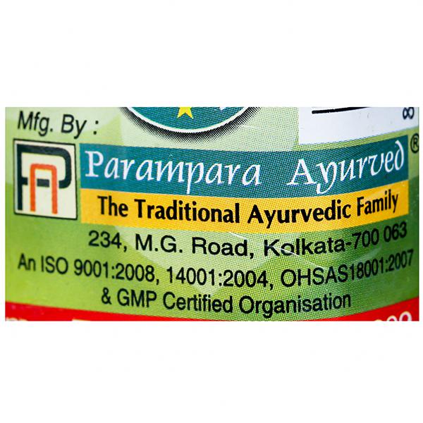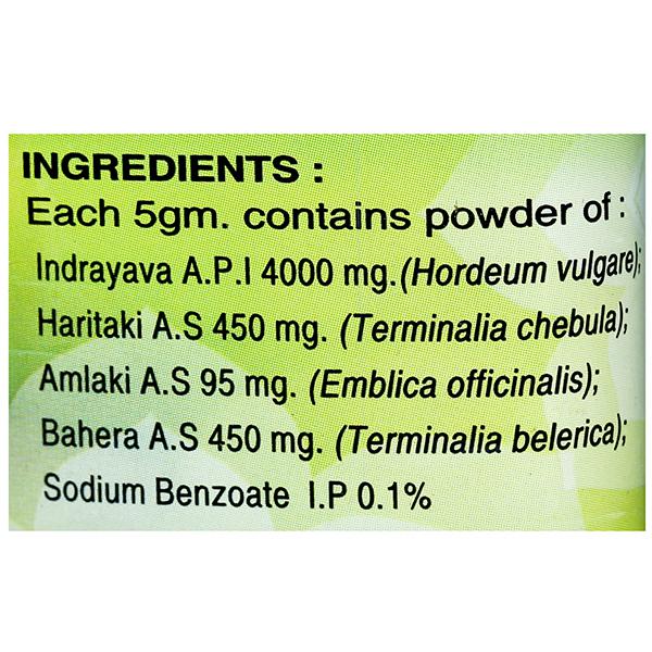 Indrayava A.P.I 4000 mg (Hordeum vulgare), Haritaki A.S 450 mg, (Terminalia Chebula), Amlaki A.S 95 mg (Emblica officinalis), Bahera A.S 450 mg (Terminalia belerica), Sodium Benzoate I.P. 0.1%