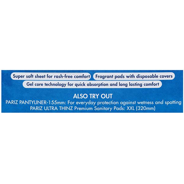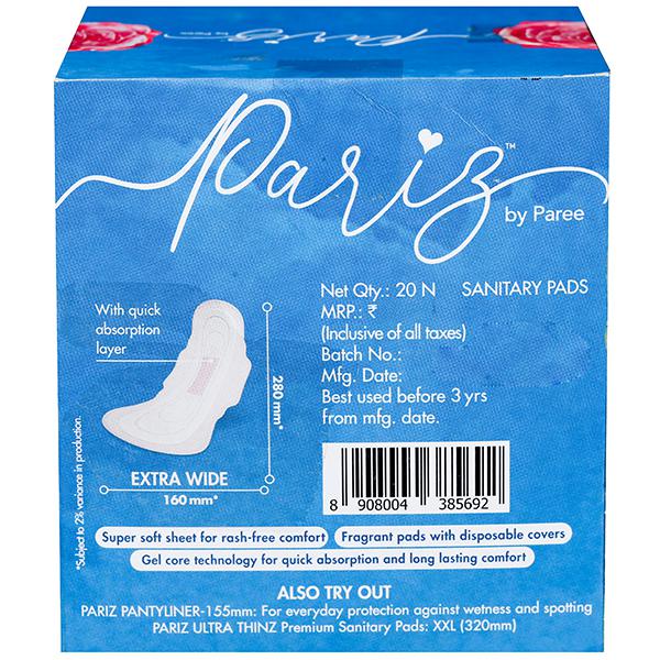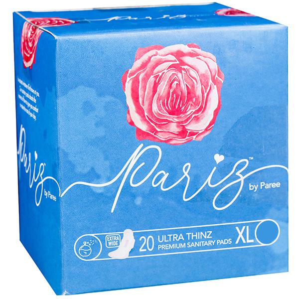 Get free pack of pariz multi-purpose wipes with paree pariz xl 20 pads pariz by paree is best in class tri-fold and super thin pads with fragrance. Super soft- it has special petal soft top surface that prevents rashes & itching and gives a comfortable feel round the clock on the days of heavy flow too quick absorption layer - it comes with a quick absorption layer in centre with added gel core technology to absorb the fluid quickly and provide you extra comfort throughout it has gentle fragrance that does away with all the period odour and keeps you fresh round the clock easy to carry and even simpler to dispose of with its trifold disposable covers it comes with wings that provide better grip to the pads and avoids slipping & leakage from sides this pack contains xl size 20 tri-fold pads.