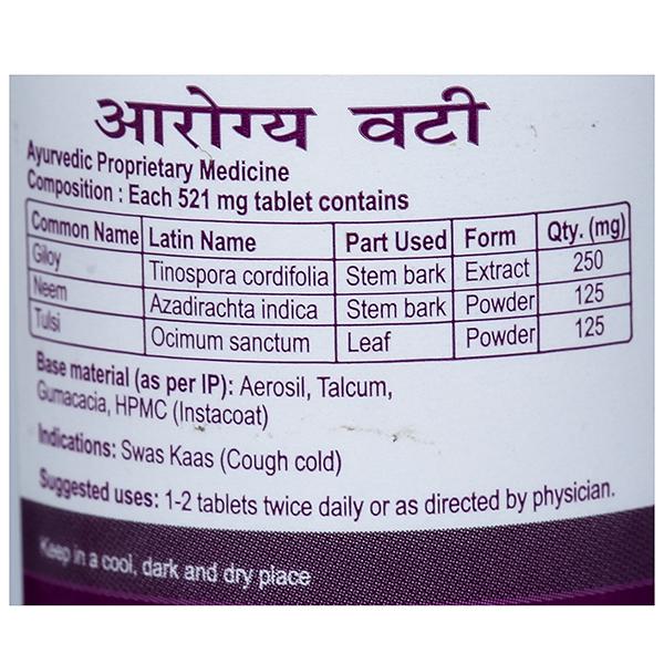 Patanjali arogya vati improves health. It has natural anti-biotic and anti-viral properties. It supports skin & imbalance tridosh. It helps strengthening the immune system.