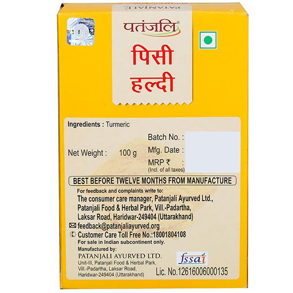 Product Information:- Patanjali Turmeric Powder means the powder obtained by grinding clean, sound, dried mature roots of Turmeric. It adds a mild flavour and aroma to sweet and savoury food preparations.