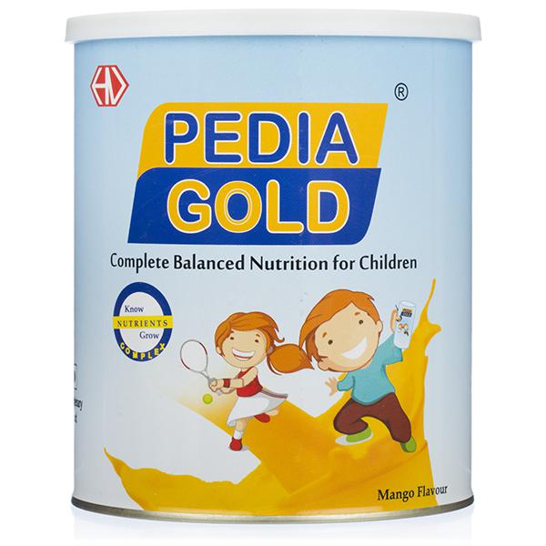 Pedia Gold helps fill gaps in the diet of your junior to provide sucrose for instant energy. It is rich in high quality whey protein concentrates that helps in growth and development. It is enriched with FOS (dual role of prebiotic and fibre) to maintain GI flora. It is enriched with DHA (omega 3 fatty acid) and ARA (omega-6 fatty acid) which helps in your child’s neurodevelopment. It is enriched with Choline that assists memory and learning and Inositol which is also known as brain food. Together they work closely to help keep the brain and central nervous system working perfectly. Pedia Gold provides 28 essential vitamins & minerals. It is ideal for enteral & oral feeding. It is Lactose, Gluten & Cholesterol free and comes in a delicious Mango flavour. It is aimed for the fussy eater, children with lactose intolerance, post- surgery convalescence, enteral feeding, intensive care, special need or for special nutrition on discharge from hospital.