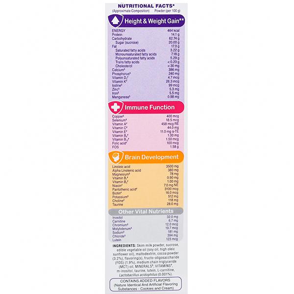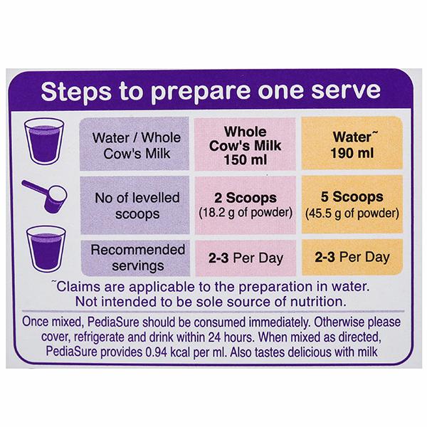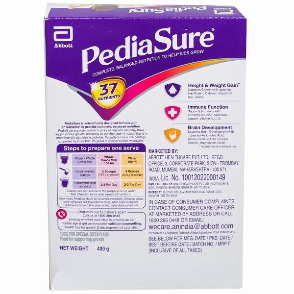 Product Information - PediaSure is a nutritional supplement that provides complete, balanced nutrition for children 2 years & above– those special years of rapid growth and development. When consumed in proper amounts, PediaSure is scientifically formulated to provide 100% of the recommended dietary allowance for Macro nutrients (Carbohydrates, proteins & fats) & micronutrients (Vitamins & Minerals) that are required for growth and development. PediaSure is scientifically shown to help increase height and weight, reduce chances of infection & sick. PediaSure also contains nutrients such as Taurine, Choline and Omega 3 & 6 fatty acids to help support brain development.