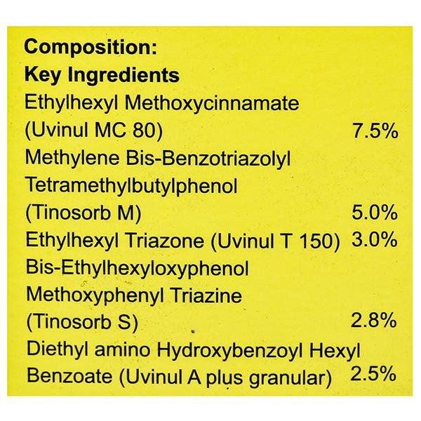Ethylhexyl Methoxycinnamate (Uvinul MC 80) 7.5 % + Methylene Bis-Benzotriazolyl Tetramethylbutylphenol (Tinosorb M) 5.0 % + Ethylhexyl Triazone (Uvinul T 150) 3.0 % + Bis-Ethylhexyloxyphenol Methoxyphenyl Triazine (Tonosorb S) 2.8 % + Diethyl amino Hydroxybenzoyl Hexyl Benzoate (Uvnul A plus granular) 2.5 %.