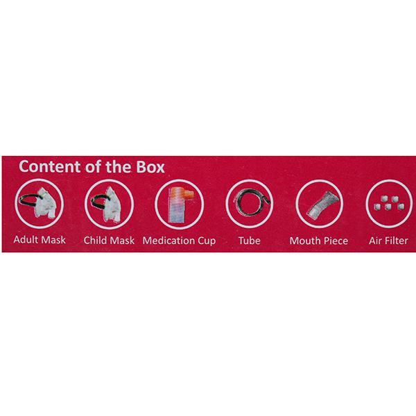 Adult Mask, Child Mask, Medication Cup, Tube, Mouth Piece and Air Filter.