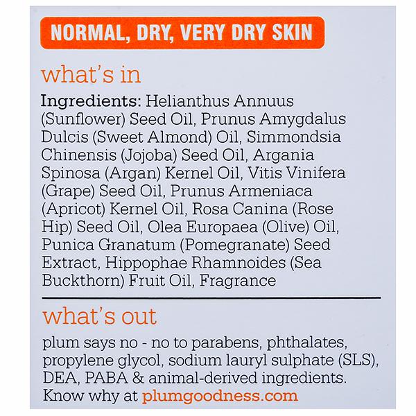 Meet the ultimate dry skin expert - Plum Grape Seed & Sea Buckthorn Glow-Restore Face Oils Blend. It is a unique combination of 100% plant-derived oils (there's 10 of them!) that combats skin dryness and restores a natural and healthy glow to your skin. All of that, without the greasiness that one would expect from an oil. The grape seed and sea buckthorn facial oil works instantly to restore your natural glow, replenish lost nutrients fight oxidative damage and prevent Transepidermal Water Loss (TEWL) from your skin.