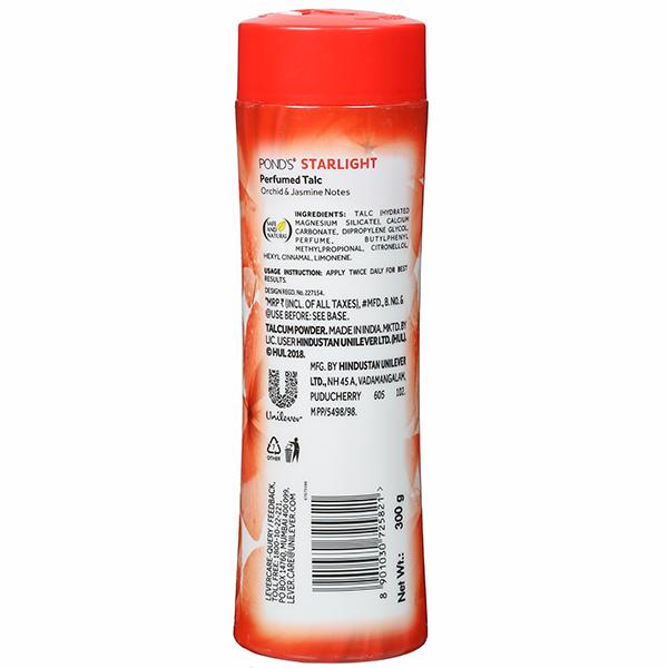 Ponds Starlight talc is an elegant feminine combination of fresh & fruity notes of passion fruit and blueberry with a rich floral bouquet of creamy white blossoms and delicate orchid. This unforgettable perfume talc is curated to stay on you for your entire workday or a day out with friends or a long dinner date. It gives you long lasting fragrance for upto 6 hours!