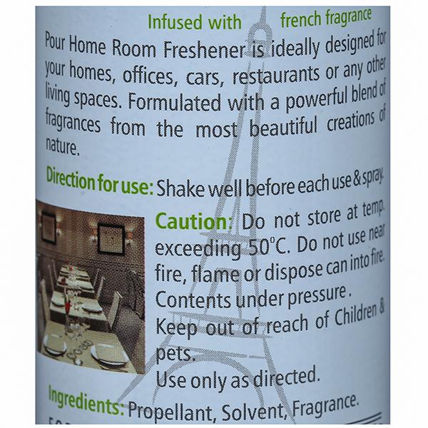 Product Information - Pour home Just Jasmine room freshener comes in a regular cylindrical can with cap. Pour Home Room Freshner is ideally designed for your homes, offices, cars, restaurants or any other living spaces. Formulated with a powerful blend of Fragrances from the most beautiful creations of nature.