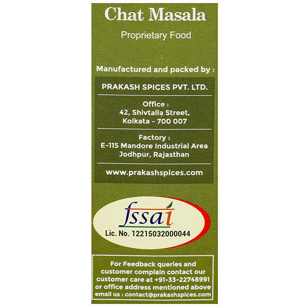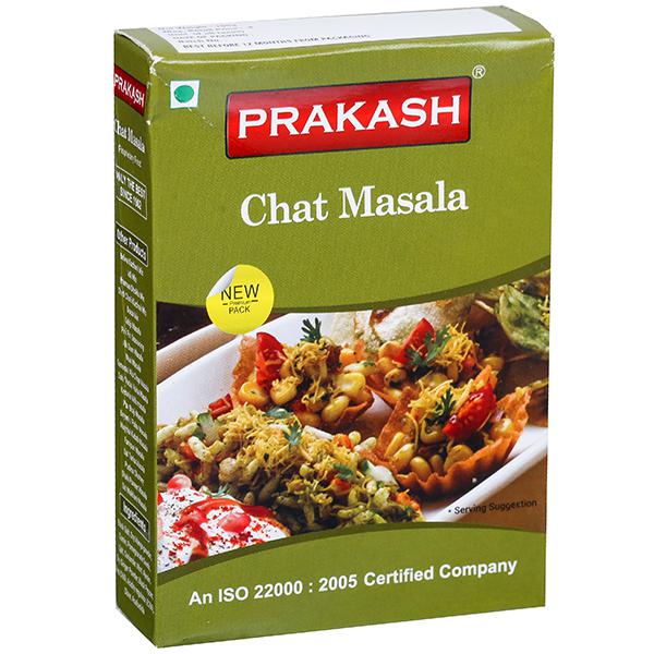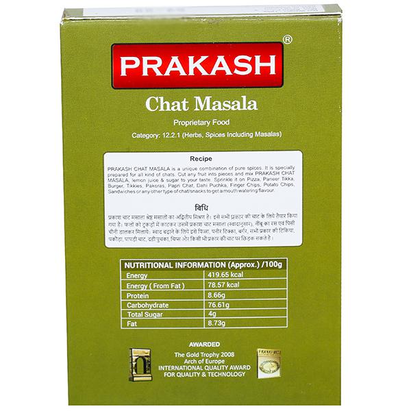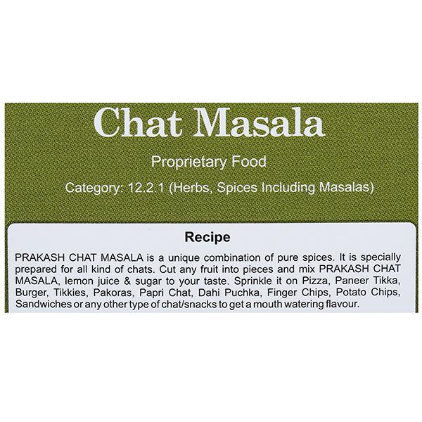 PRAKASH CHAT MASALA is a unique combination of pure spices. It is specially prepared for all kinds of chats. Cut any fruit into pieces and mix PRAKASH CHAT MASALA, lemon juice, sugar to your taste. Sprinkle it on pizza, paneertikka, burger, tikkies, pakoras, papri chat, dahipuchka, finger chips, potato chips, sandwiches or any other type of chat/ snacks to get a mouthwatering flavor.