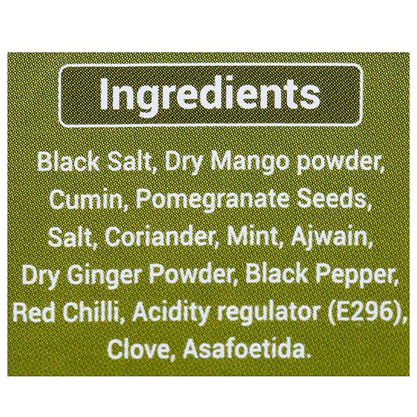 Pomegranate Seeds, Dry Mango Powder, Roasted Cumin, Black Salt, Common Salt, Mint, Ajwain, Sonth, Black Pepper, Chilly, Citric Acid, Peepal, Asafoetida.