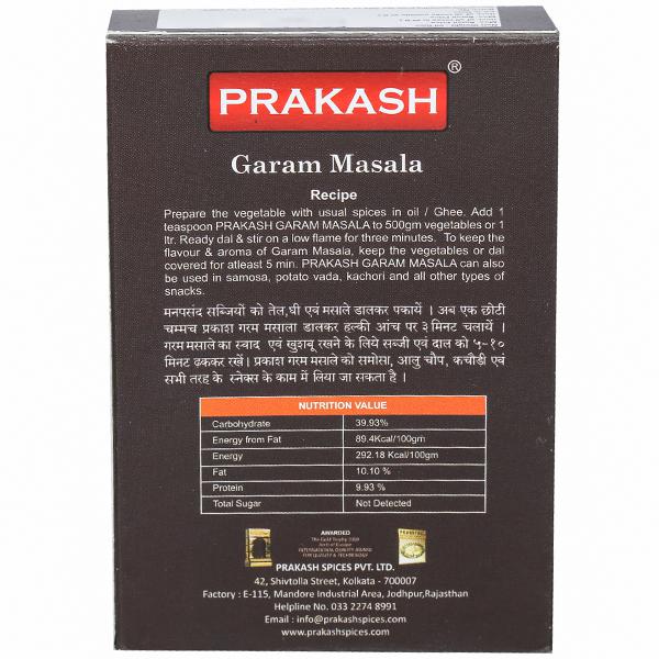 Prepare the vegetable with usual spices in oil/ ghee. Add 1 teaspoon PRAKASH GARAM MASALA to 500gm vegetables or 1 ltr. Ready dal and stir on a low flame for 3 minutes. To keep the flavor and aroma of Garam Masala, keep the vegetables or dal covered for at least 5 minutes. PRAKASH GARAM MASALA can also be used in samosa, potato vada, kachori and all other types of snacks.