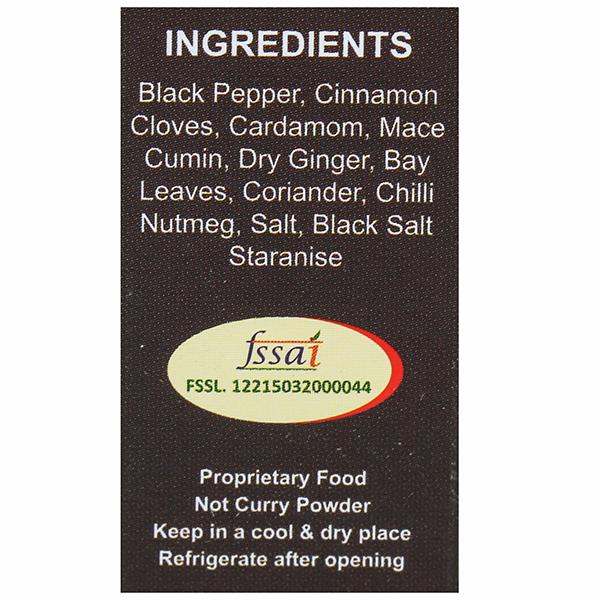 Black Pepper, Cinnamon, Cloves, Cardamom, Mace, Cumin, Dry Ginger, Bay Leaves, Coriander, Chili, Nutmeg, Salt, Black Salt, Staranise.