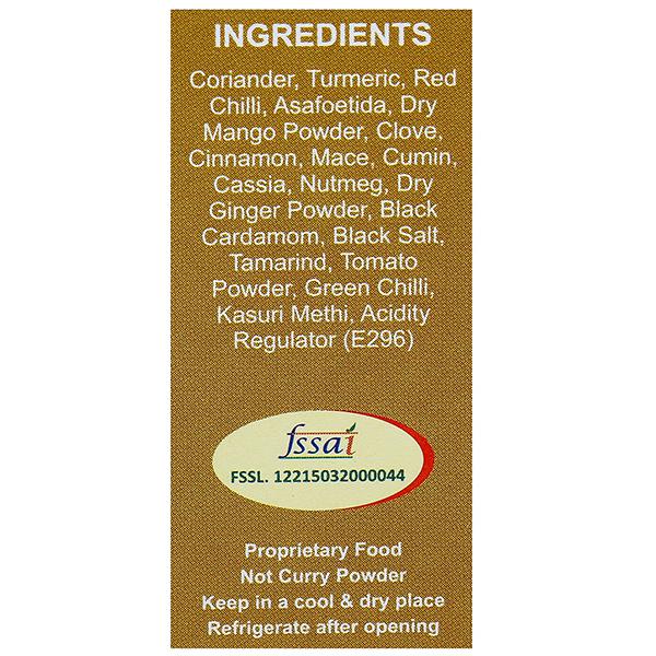 Ingredients- Coriander, turmeric, red chilli, asafoetida, dry mango powder, clove, cinnamon, mace, cumin, cassia, nutmeg, dry ginger powder, black cardamom, black salt, tamarind, tomato powder, green chilli, kasuri methi, acidity regulator ( E 296)