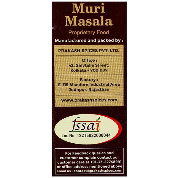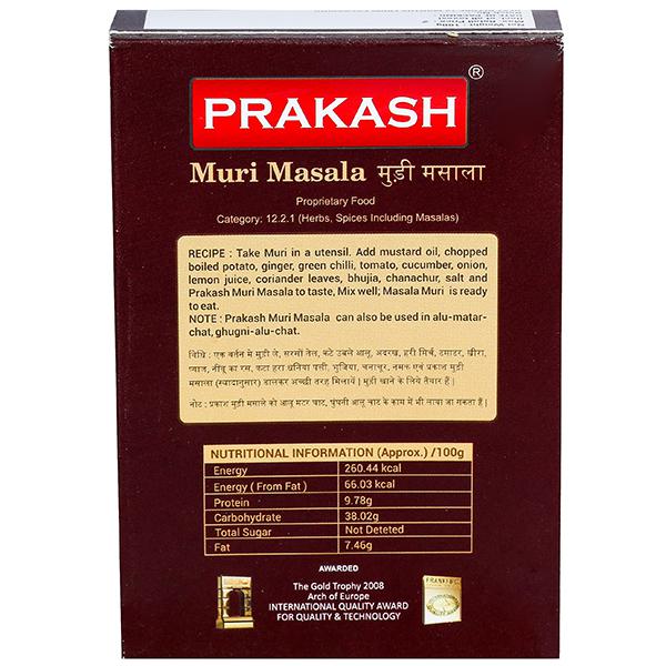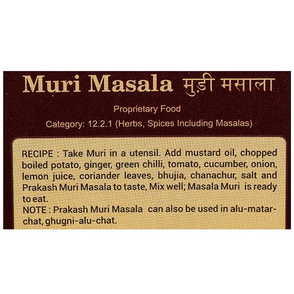 Take Muri in a utensil.Add mustard oil, chopped boiled potato, ginger, green chilli, tomato, cucumber, onion, lemon juice, coriander leaves, bhujia, chanachur, salt and PrakashMuri Masala to taste, mix well; Masala muri is ready to eat. Note: PrakashMuri Masala can also be used in alu-matar chat, ghugni-alu-chat.