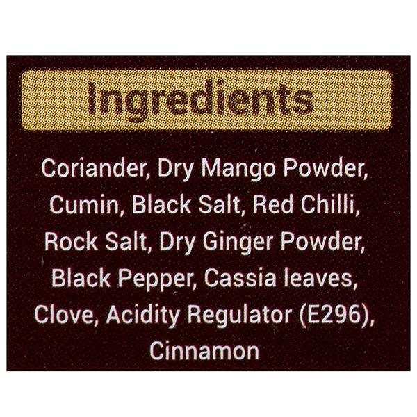 Coriander, Cumin, Black Pepper, Cinnamon, Cloves, Cassia, Chilli, Dry Mango Powder, Black Salt, Rock Salt, Dry Ginger Powder, Mallic Acid, Asafoetida, KababChini.