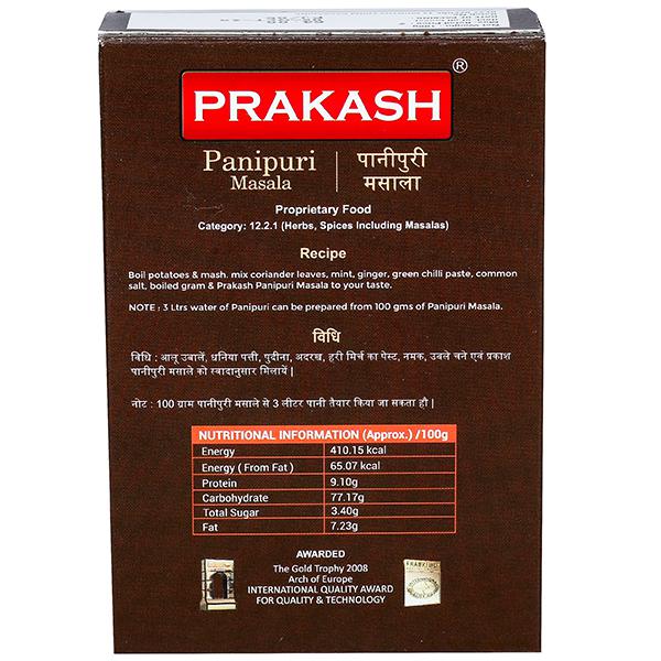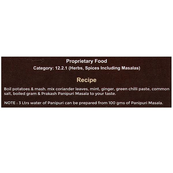 Boil potatoes, &mash. Mix coriander leaves, mint, ginger, green Chili paste, common salt, boiled gram &PrakashPanipuri Masala to your taste. Note: 3 ltrs water of Panipuri can be prepared from 100gms of Panipuri Masala.