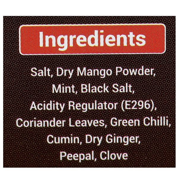 Pudina, Dry Mango Powder, Green Chili, Mallic Acid, Salt, Clove, KababChini, Black Salt, Coriander Leaves, Dry Ginger Powder, Peepal, Roasted Cumin Powder.