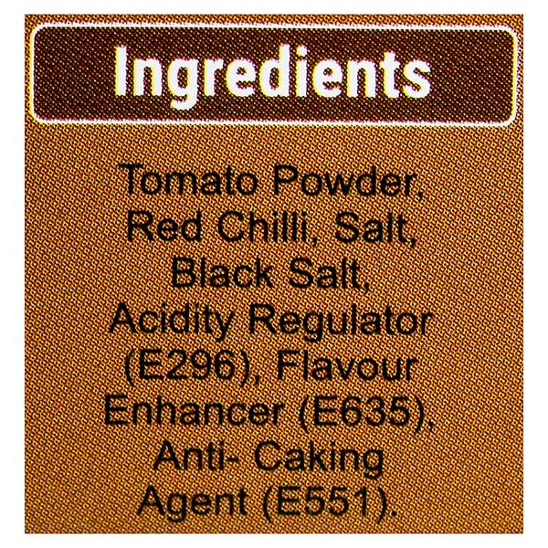 Tomato Powder, Red Chili, Salt, Black Salt, Acidity Regulator (E296), Flavour Enhancer (E635), Anti Caking Agent (E551).