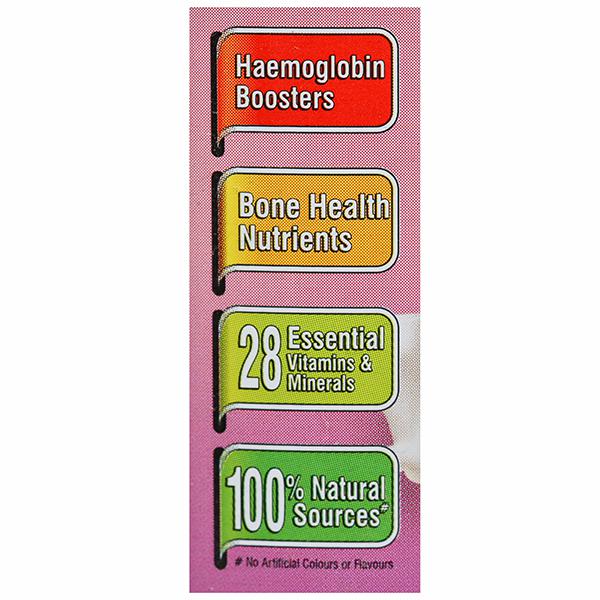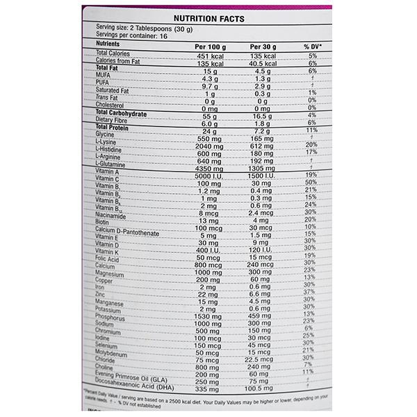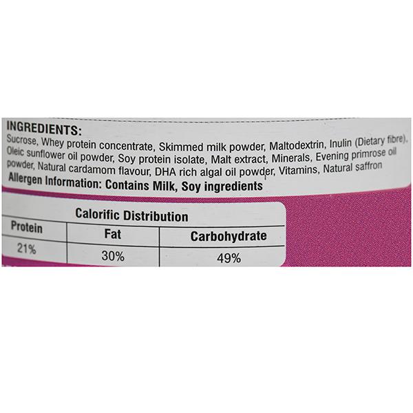 Ingredients - Sucrose, whey protein concentrate, Skimmed milk powder, Maltodextrin, Inulin (Dietary Fibre), Oleic sunflower oil Powder, Soy protein Isolate, Malt Extract, Minerals, Evening primrose oil powder, Natural cardamom flavour, DHA rich algal oil powder, vitamins, natural saffron.