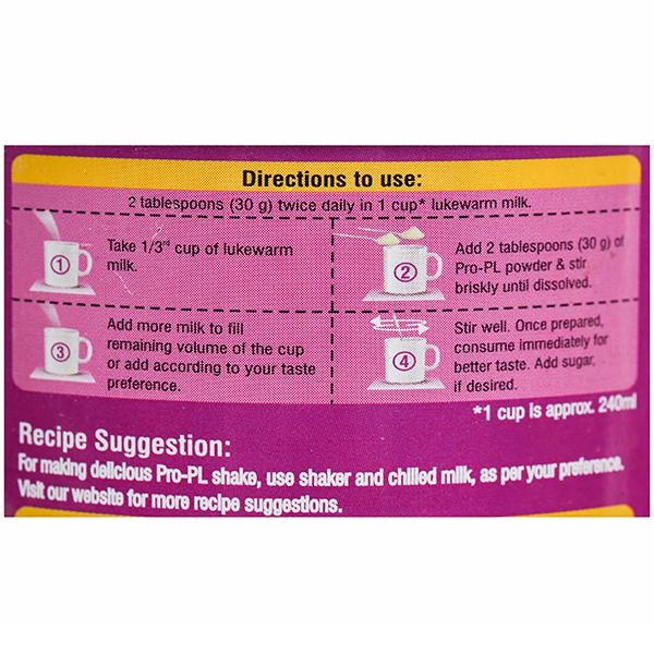 How to use - 2 tablespoons (30g) twice daily in 1 cup lukewarm milk. Take 1/3rd cup of lukewarm milk. add 2 tablespoons (30g) of Pro-PL powder and stir briskly until dissolved. Add more milk to fill remaining volume of the cup or add according to your taste preference. Stir well. Once prepared, consume immediately for better taste. Add sugar if desired.