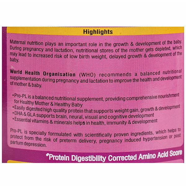 Pro PL Cardamom Flavour Powder is a prenatal and nursing women's nutritional supplement. It is a comprehensive nutrition supplement for pregnant and lactating women that contains protein, DHA (Docosahexaenoic Acid), GLA (Gamma-Linoleic Acid) and 28 other essential vitamins and minerals that support both the mother and child’s health by supplying the needed healthy dose. Pro PL Cardamom Flavour Powder is crucial in pregnancy as it makes sure that the mother’s body doesn’t lose out on the naturally existing nutritional stores.