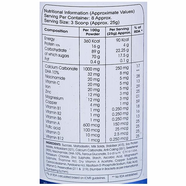 Energy: 360 Kcal, Protein 10%: 16 g, Carbohydrate: 89 g of which sugars: 70 g, Fat: 0.4 g, Calcium Carbonate: 1000 mg, DHA 10%: 32 mg, Niacinamide: 20 mg, Vitamin C: 20 mg, Iron: 20 mg, Zinc: 12 mg, Magnesium: 12 mg, Copper: 4 mg, Vitamin B1: 1 mg, Vitamin B2: 1 mg, Vitamin B6: 1 mg, Vitamin A: 600 mcg, Folic Acid: 100 mcg, Vitamin D: 10 mcg, Vitamin B12: 1 mcg