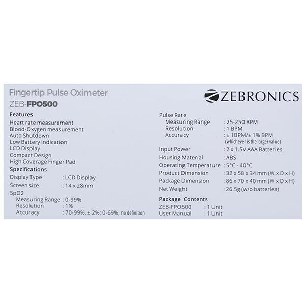 Pulse Oximeter (Zebronics) ZEBFPO500 Device 32 x 58 x 34 mm