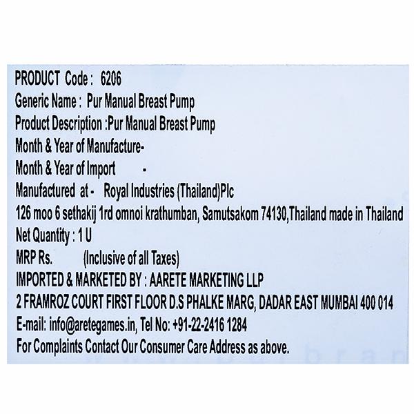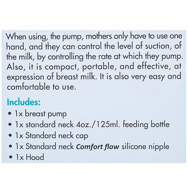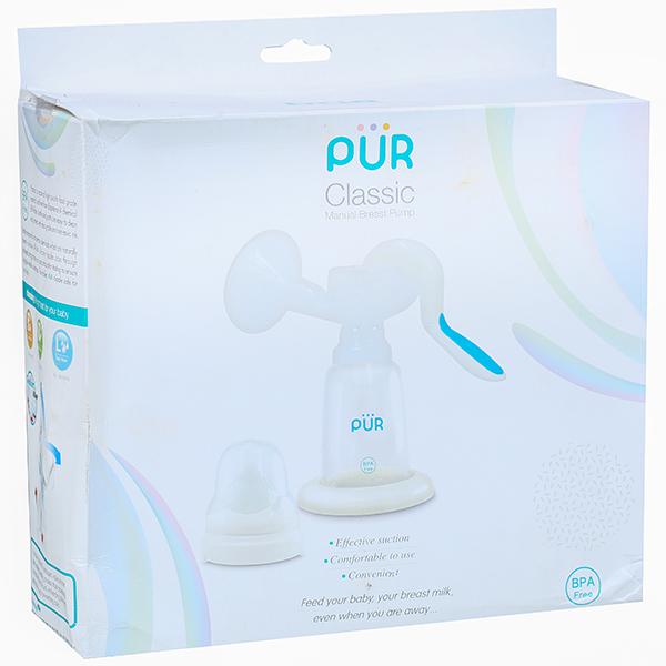 Product Information – Pur Manual Breast Pump includes 1 breast pump, 1 standard neck 4oz./125ml feeding bottle, 1 standard neck cap, 1 standard neck comfort flow silicone nipple and 1 hood, Best for your baby. Made in Thailand.