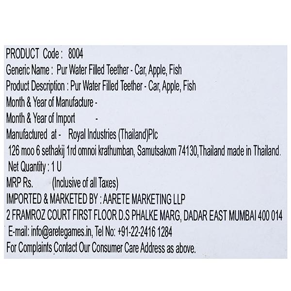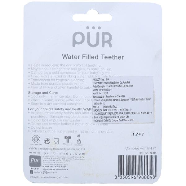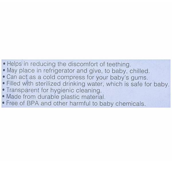Product Information- PUR Water filled Teether made in Thailand. Best for your baby. PUR Water filled Teether helps in reducing the discomfort of teething & acts as a cold compress for baby's gums. The Teether is filled with sterilized drinking water, which is safe for baby. The product is Transparent for hygienic cleaning. The Product is Free of BPA and other harmful chemicals.