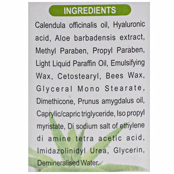 Calendula officinalis oil, Hyaluronic acid, Aloe barbadensis extract, Methyl Paraben, Propyl Paraben, Light Liquid Paraffin Oil, Emulsifying Wax, Cetostearyl, Bees Wax, Glyceral Mono Stearate, Dimethicone, Prunus amygdalus oil, Caprylic/capric triglyceride, Iso propyl myristate, Di sodium salt of ethylene di amine tetra acetic acid, Imidazolidinyl Urea, Glycerin, Demineralised Water.