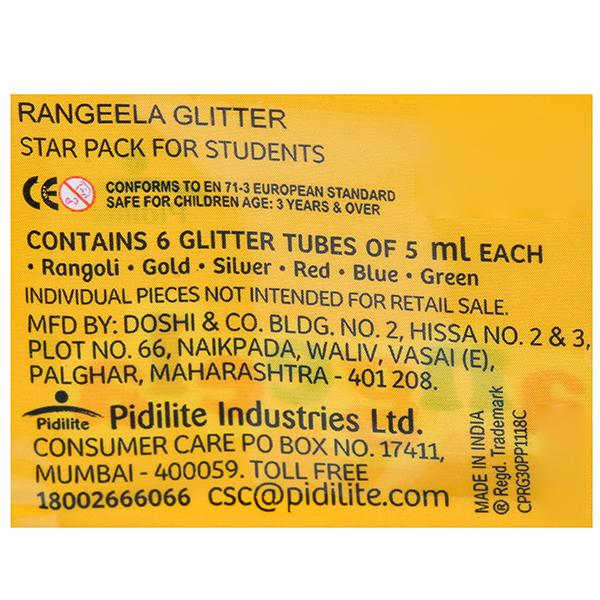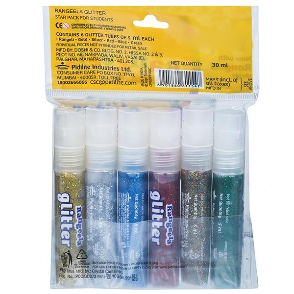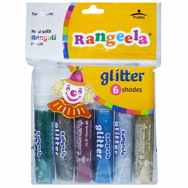 Glitters are used by kids to give a fascinating effect to their paintings and models. And rangeela is the best liquid glitter available. Contains 6 paper glitter tubes Silver, Gold, Green, Blue, Red and Magenta. Decorate anything from paper to earthenware with these glitters and see how your projects shine. Rangeela Paper Glitter which are available in micronized form providing ease of dispersion and fine grind. Widely used to make decorative products, cosmetics, textile and plastic molding. Fine nozzle for fine outlining & filling Ideal for decorating greeting cards, pots, paintings, thermocol etc.