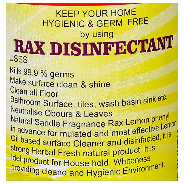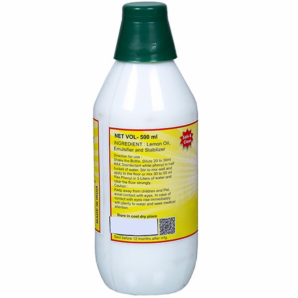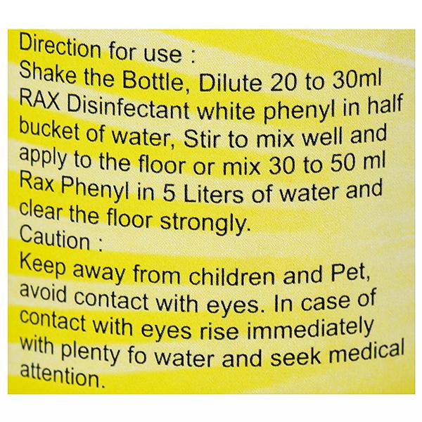 How to use – Shake the bottle, dilute 20 to 30 ml Rax Disinfectant white phenyle in half bucket of water. Stir to mix well and apply to the floor.
