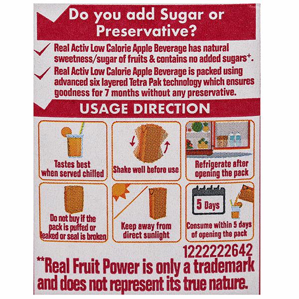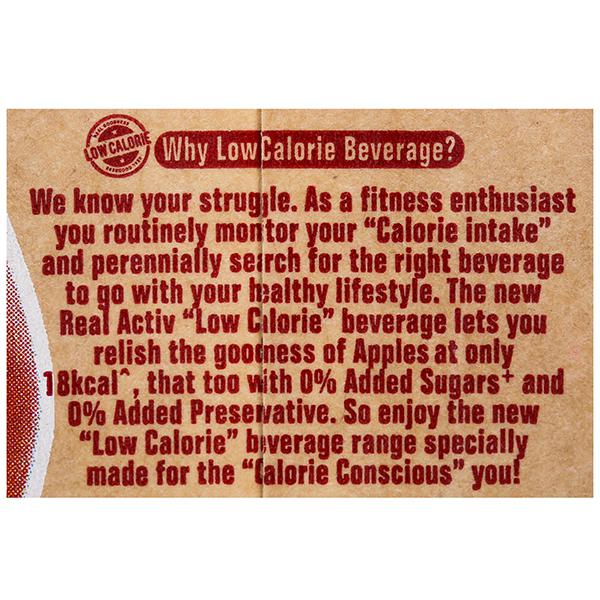 We know your struggle, as a fitness enthusiast you routinely monitor your "calorie intake" And perennially search for the right beverage to go with your healthy lifestyle. The new Real active "low calorie" Beverage lets you relish the goodness of apples at only 18kcal, that too with 0% added sugars, and 0% added preservative. So enjoy the new "low calorie" Beverage range especially made for the "calorie conscious" You! It comes in classy tetra pack. Packaging is paper based and 100% recyclable which means you also care for nature while savouring the goodness of what nature has to offer. Real care.