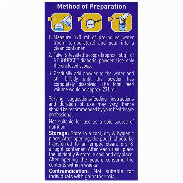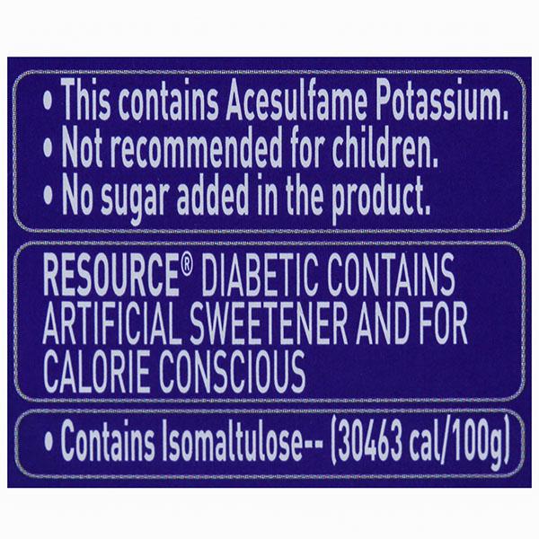 Product Information - Resource Diabetic is a supplement that is specifically formulated for people with diabetes. It is low in carbohydrate (with no added sucrose), high in protein and contains soluble and insoluble fibre.