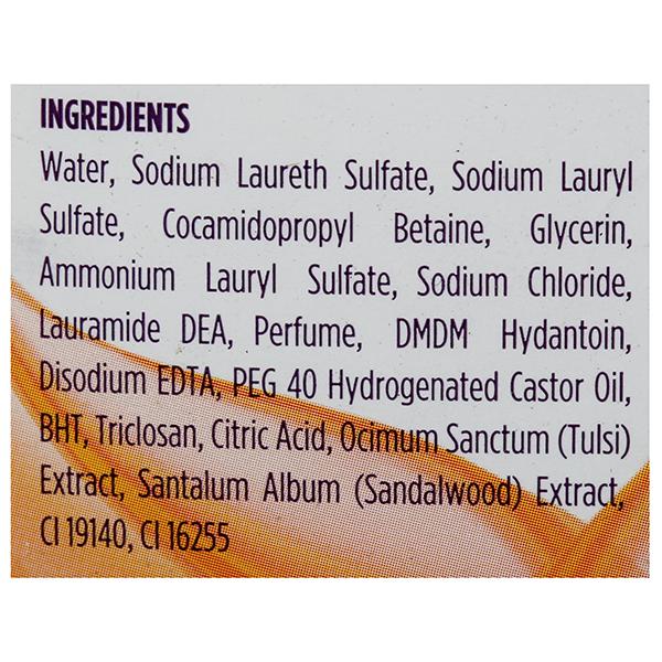 Water, Sodium Laureth Sulfate,Sodium Lauryl Sulfate, Cocamidopropyl Betaine, Glycerin, Ammonium Lauryl Sulfate,Sodium Chloride, Lauramide DEA, Perfume,DMDM Hydantoin, Disodium EDTA, PEG 40 Hydrogenated Castor Oil, BHT, Triclosan,Citric Acid, Ocimum Sanctum (Tulsi) Extract, Santalum Album (Lotus) Extract, CI19140,CI16255