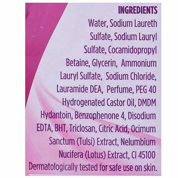 Water, Sodium Laureth Sulfate,Sodium Lauryl Sulfate, Cocamidopropyl Betaine, Glycerin, Ammonium Lauryl Sulfate,Sodium Chloride, Lauramide DEA, Perfume,DMDM Hydantoin, Disodium EDTA, PEG 40 Hydrogenated Castor Oil, BHT, Triclosan,Citric Acid, Ocimum Sanctum (Tulsi) Extract, Santalum Album (Lotus) Extract, CI19140,CI16255