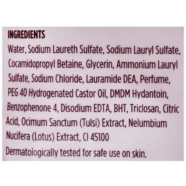 Water, Sodium Laureth Sulfate,Sodium Lauryl Sulfate, Cocamidopropyl Betaine, Glycerin, Ammonium Lauryl Sulfate,Sodium Chloride, Lauramide DEA, Perfume,DMDM Hydantoin, Disodium EDTA, PEG 40 Hydrogenated Castor Oil, BHT, Triclosan,Citric Acid, Ocimum Sanctum (Tulsi) Extract, Santalum Album (Lotus) Extract, CI19140,CI16255