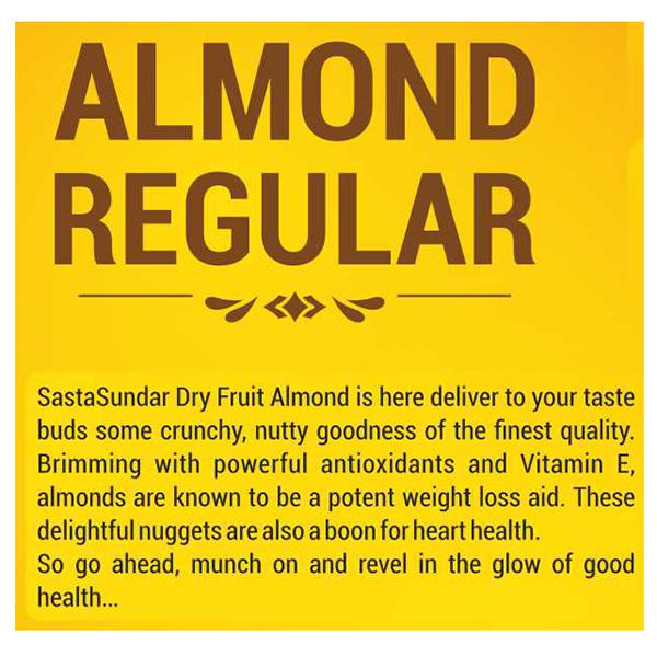 SastaSundar Dry Fruit Almond is here deliver to your taste buds some crunchy, nutty goodness of the finest quality. Brimming with powerful antioxidants and Vitamin E, almonds are known to be a potent weight loss aid. These delightful nuggets are also a boon for heart health.