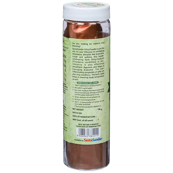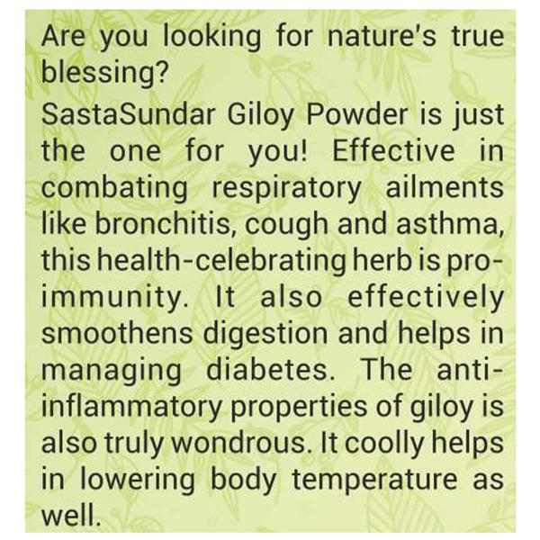 SastaSundar Giloy Powder is just the one for you! Effective in combating respiratory ailments like bronchitis, cough and asthma, this health-celebrating herb Giloy/Guduchi(Tinospora cordifolia) is pro-immunity. It also effectively smoothens digestion and helps in managing diabetes. The anti-inflammatory properties of giloy is also truly wondrous. The herb coolly helps in lowering body temperature as well.