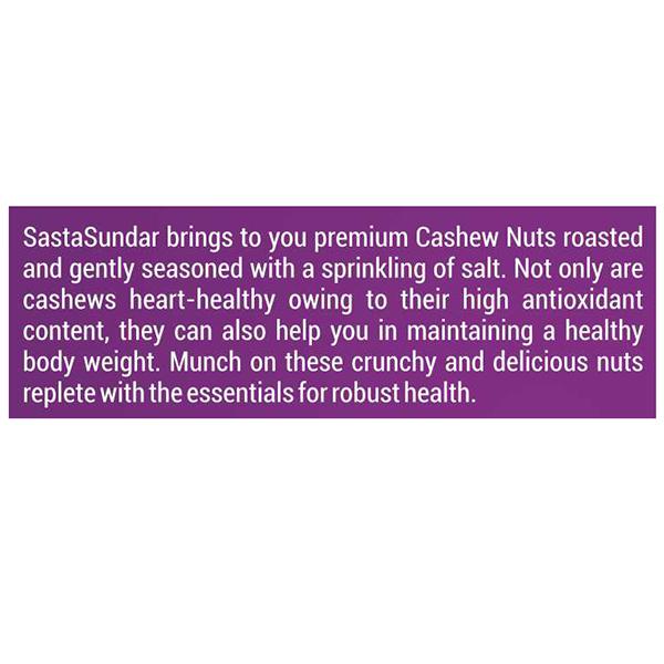 SastaSundar brings to you Premium Cashew Nuts roasted and gently seasoned with a sprinkling of salt. Not only are cashews heart-healthy owing to their high antioxidant content, they can also help you in maintaining a healthy body weight. Munch on these crunchy and delicious nuts replete with the essentials for robust health.