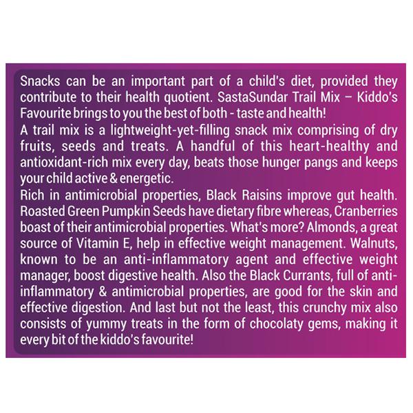 Snacks can be an important part of a child’s diet, provided they contribute to their health quotient. SastaSundar Trail Mix – Kiddo’s Favourite brings to you the best of both - taste and health!