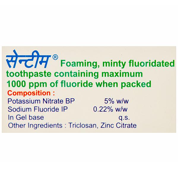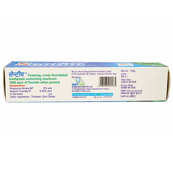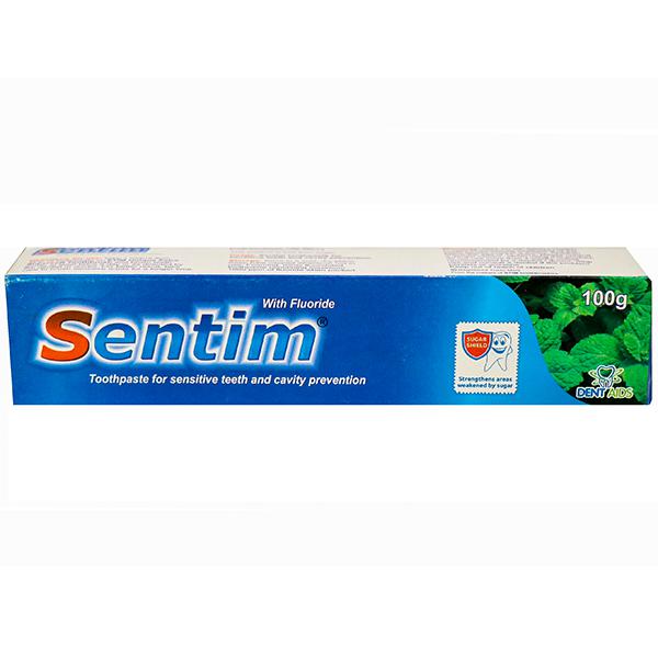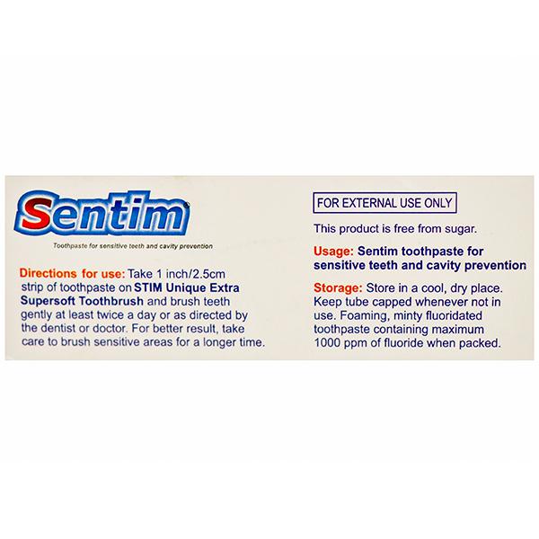 Product Information - Sentim Toothpaste is a desensitizing toothpaste that contains a unique formulation of potassium nitrate, fluoride, triclosan and zinc citrate in a frothy, mint-flavoured base. It provides relief from dentinal sensitivity and also prevents cavities.