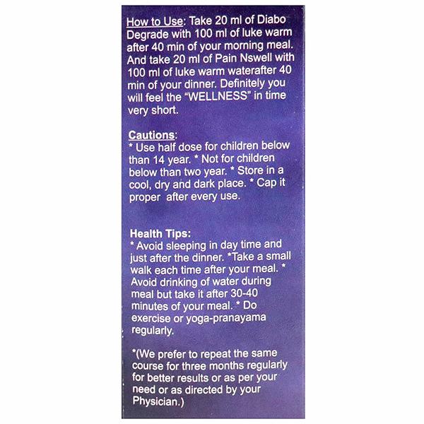 Take 10-15 ml of ‘Diabo Degrade’ with 100 ml of lukewarm water twice in a day. Take first dose in the morning afer 30-40 min of breakfast and second dose after 30-40 min of your dinner OR take it as directed by your physician. (Note: keep a regular check on your sugar level.)