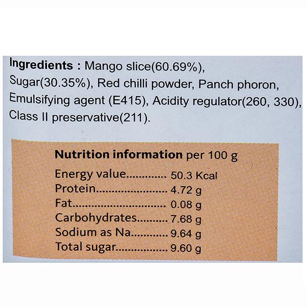 mango slice (60.69%), Sugar (30.35%), Red chili powder, Panch phoron, emulsifying agent (E415), acidity regulator (260, 330), Class II preservative (211)