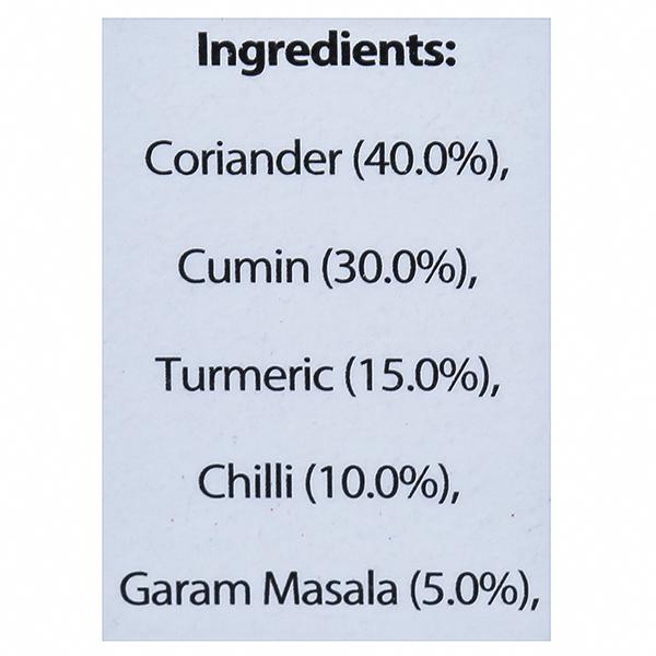 Coriander (40.0%), Cumin (30.0%), Turmeric (15.0%), Chilli (10.0%) & Garam Masala (5.0%).