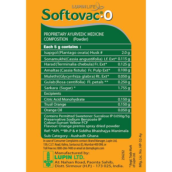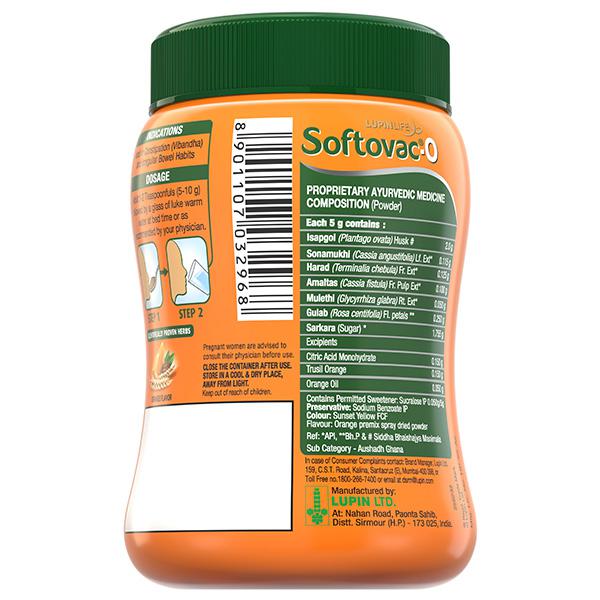 Softovac O is a scientifically proven bowel regulator, made from 100% natural actives. It is a high fibre formulation enriched with Sonamukhi, Harad, Mulethi, and Saunf. Its non-habit-forming formulation provides effective relief from constipation (Vibandha), corrects irregular bowel habits, and maintains a healthy digestive system.