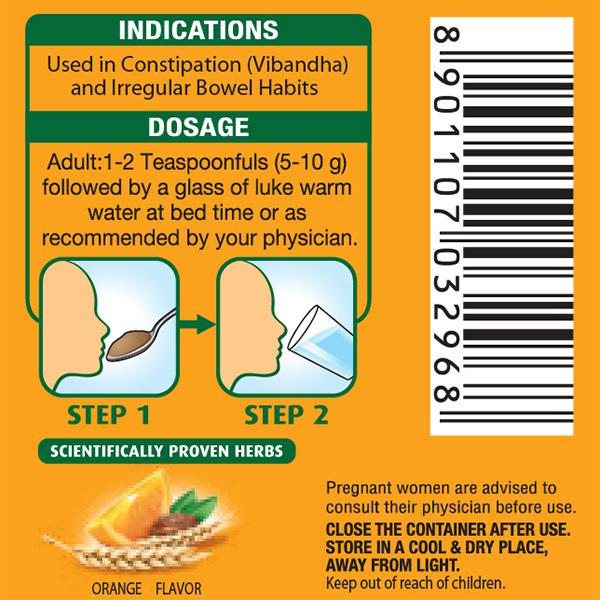Isapgol (Plantago ovata) Husk 2.0 g, Sonamukhi (Cassia angustifolia) Lf. Ext. 0.115 g, Harad (Terminalia chebula) Fr. Ext. 0.125g, Amaltas (Cassia fistula) Fr. Pulp Ext. 0.100 g, Mulethi (Glycyrrhiza glabra) Rt. Ext. 0.050 g, Gulab (Rosa centifolia) Fl. Petals 0.250 g, Sarkara (Sugar) 1.755 g, and Excipients q.s.