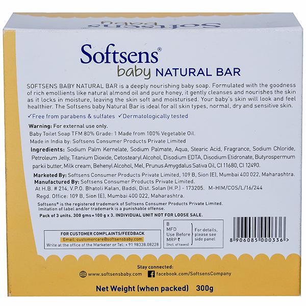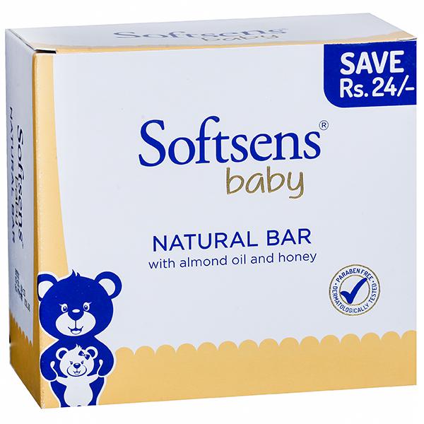 Softsens Baby Natural Bar is a deeply nourishing baby soap for visibly healthier and supple skin. Formulated with the goodness of rich emollients like natural almond oil and pure honey, it gently cleanses and nourishes your baby's delicate skin and locks in moisture, leaving behind soft, smooth, hydrated skin and a happy, delighted baby!